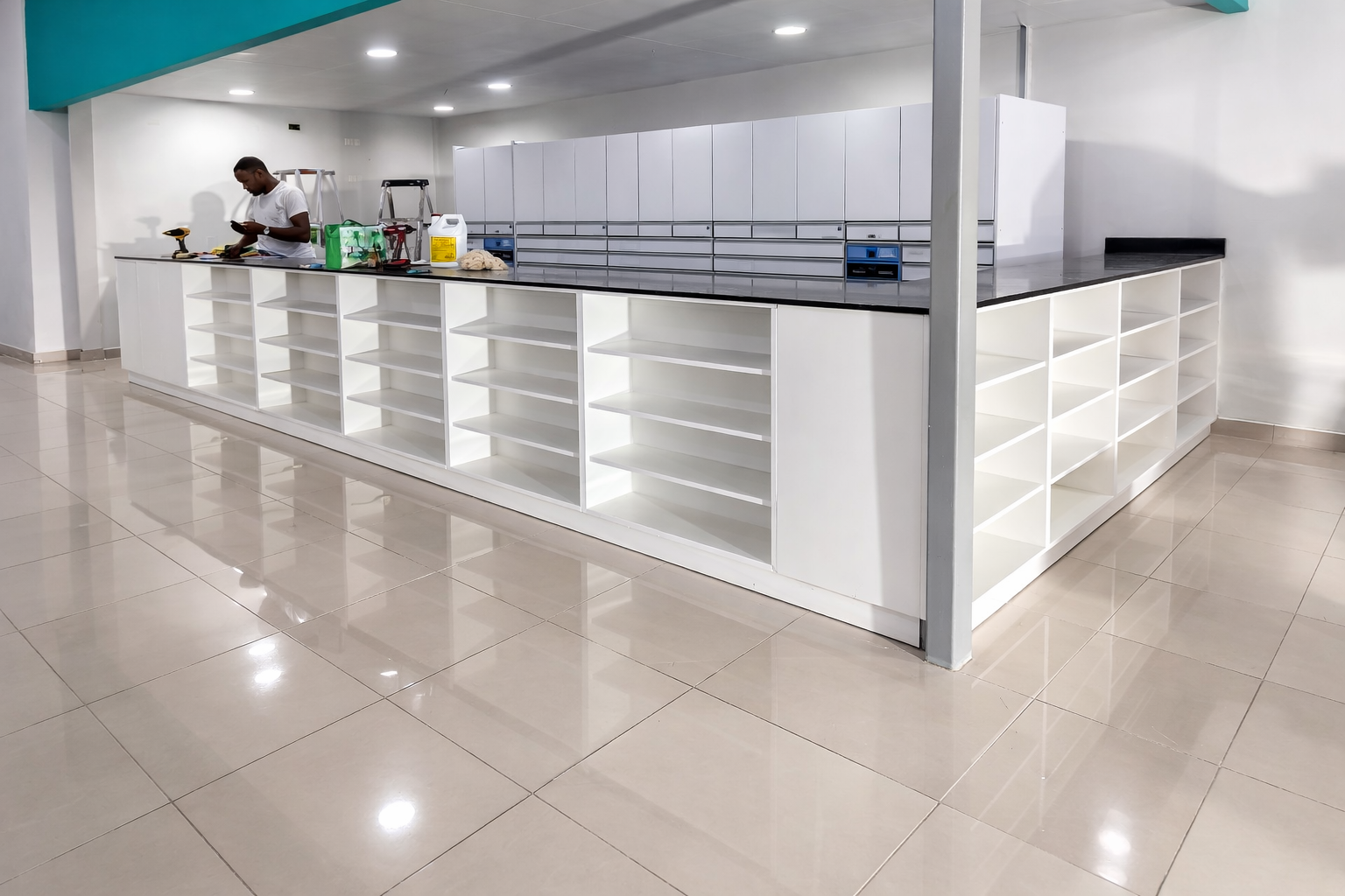 Se trabajan elementos como mostradores de atención, estaciones de trabajo, módulos de almacenamiento, gabinetes, estanterías, mobiliario para áreas de servicio y piezas complementarias, utilizando materiales de alto desempeño como melamina estructural, sobres en granito, herrajes metálicos y sistemas modulares.